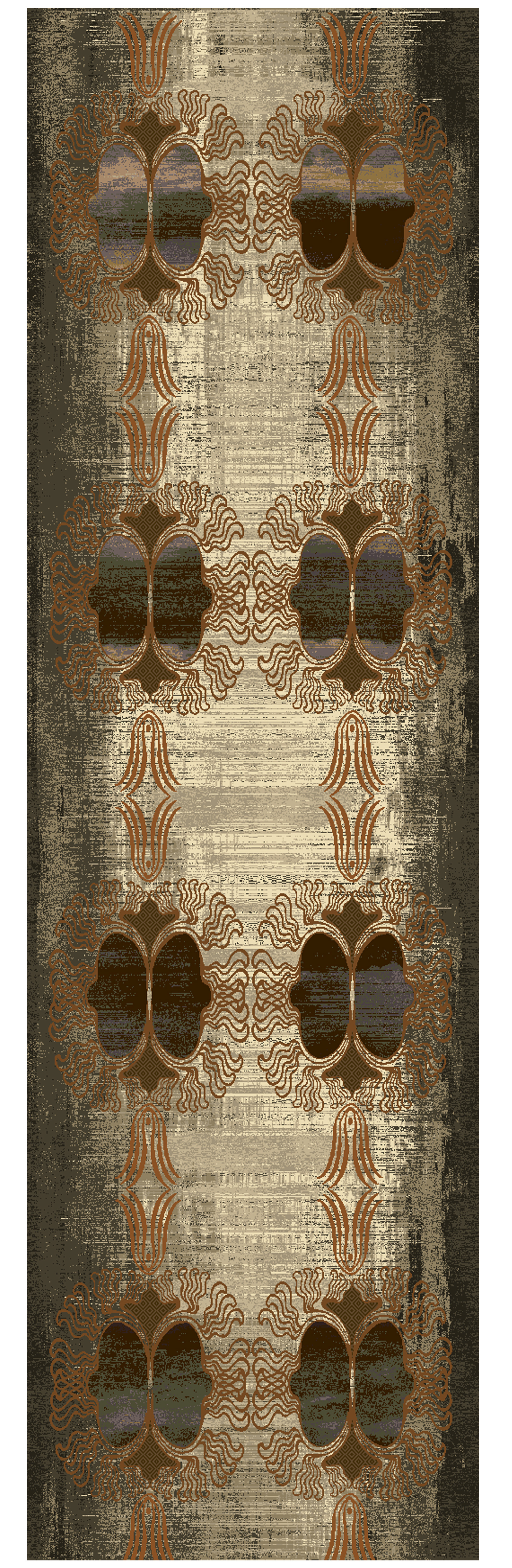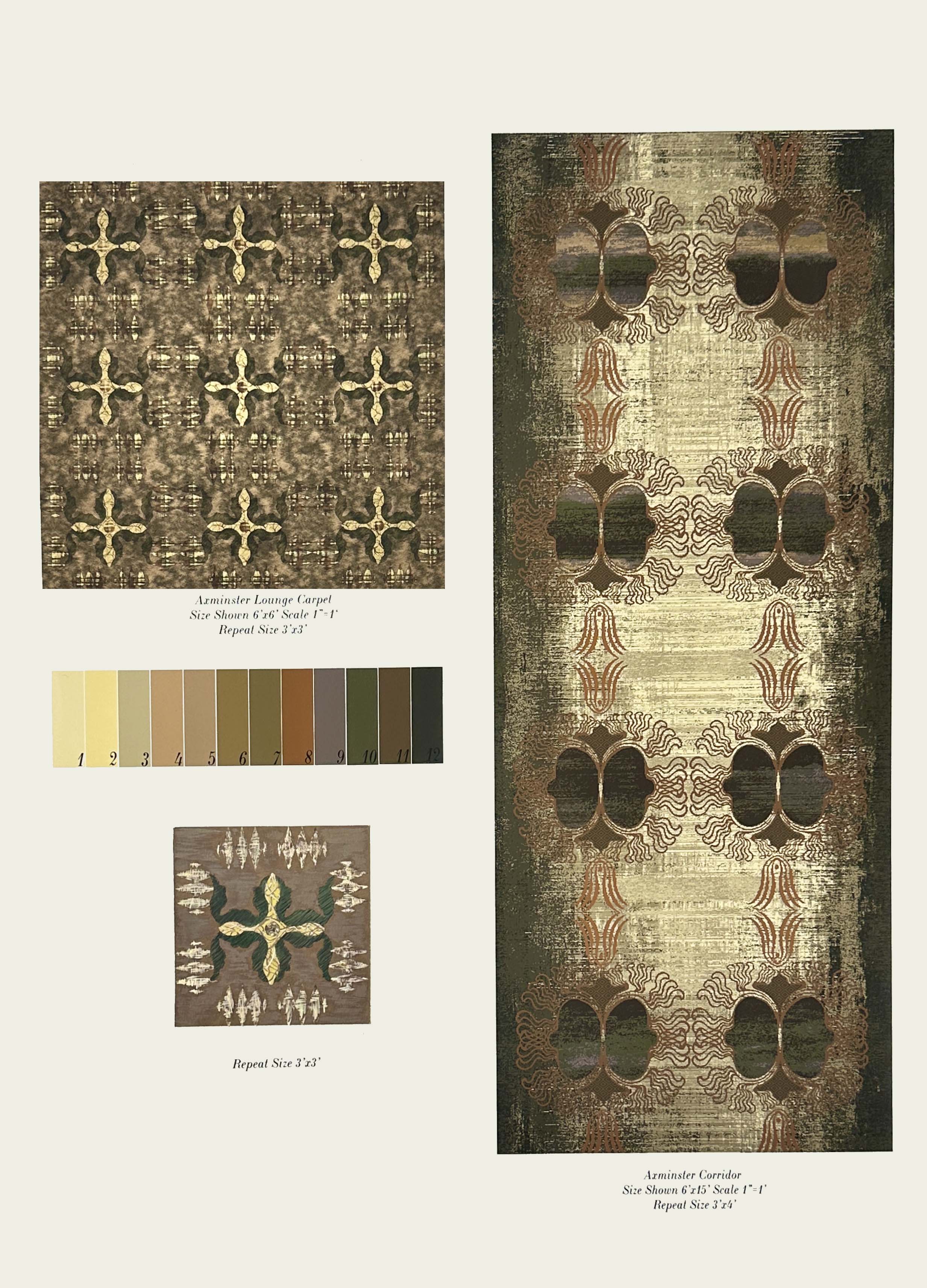 This Axminster hall carpet utilizes earthy tones, ornamental motifs, and layers of texture. Designed to combine timeless beauty with enduring durability in high traffic areas.