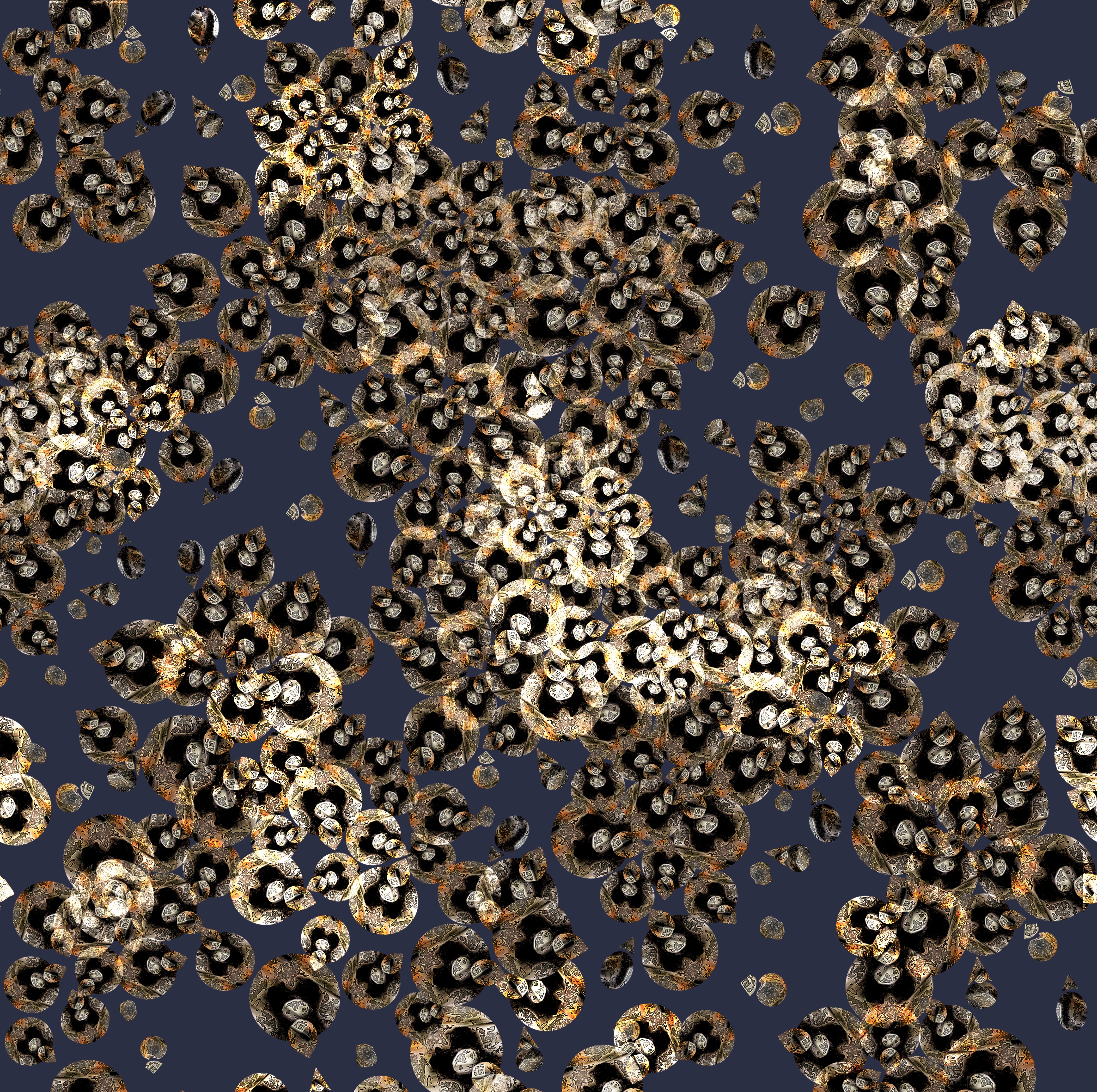 Ornamental design printed on marbled velvet. The individual abstract motifs were layered and positioned utilizing negative space form an ornamental pattern. Delicate highlights punctuate the design, drawing the eye to the texture and depth. The marble velvet creates an interplay of sheen and shadow enhances the pattern’s dimensionality, creating fabric that feels both opulent and dynamic-ideal for statement upholstery or luxe accents.